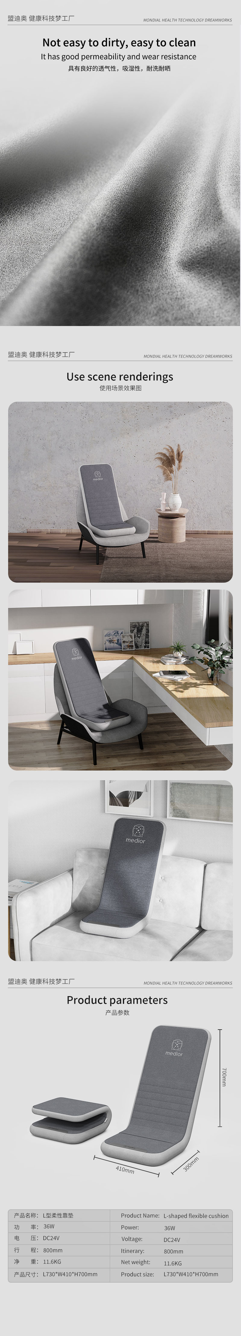 1、L型機(jī)芯結(jié)構(gòu),對(duì)折包裝縮小體積2、獨(dú)家專利柔性機(jī)芯3、力度三檔調(diào)節(jié),定點(diǎn)按摩,腰背按摩、臀腿按摩、全背按摩模式選擇4、背部行走揉捏,按摩區(qū)域加長(zhǎng)到從肩膀到大腿;5、更加貼合不同款式的椅子整體可對(duì)折收納6、亞馬遜標(biāo)準(zhǔn)包裝尺寸